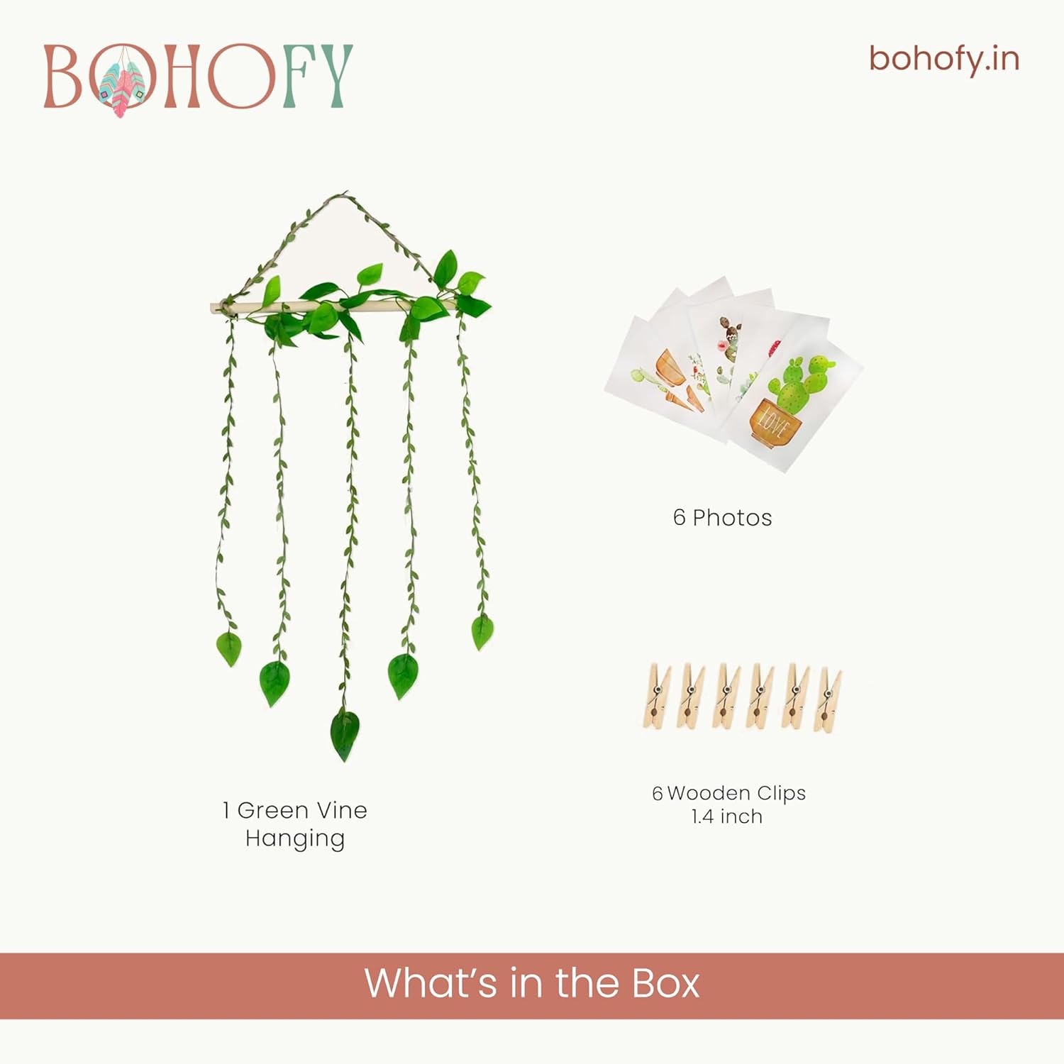 Bohofy Green Vines Wall Hanging Decoration with Wooden Photo Clips for Wall Decor Items, Home Decoration Items for Living Room, Wooden Clips for Photo Hanging